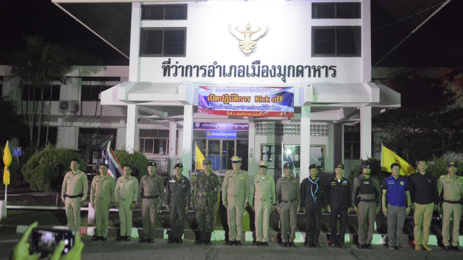 นายพรชัย พุดซ้อน นายอำเภอเมืองมุกดาหาร กล่าวว่า ปฏิบัติการ (Kick Off) ด้านการจัดระเบียบสังคม และปราบปรามผู้มีอิทธิพล เป็นนโยบายสำคัญละเร่งด่วน โดยเน้นหนักในกิจกรรมที่ไม่พึงประสงค์ 6 เรื่อง ได้แก่ ยาเสพติด การค้ามนุษย์ การครอบครองและพกพาอาวุธปืน การพนัน การดำเนินการติดตามและเฝ้าระวังผู้มีอิทธิพล สถานบริการและสถานบันเทิง จังหวัดมุกดาหารจึงได้จัดตั้งชุดเฉพาะกิจระดับจังหวัด และอำเภอ พร้อมทั้งบังคับใช้กฎหมายอย่างเคร่งครัดสำหรับผู้ที่ฝ่าฝืนตามนโยบายการจัดระเบียบสังคมและปราบปรามผู้มีอิทธิพล เพื่อสร้างสังคมให้สงบสุข บ้านเมืองเป็นระเบียบเรียบร้อย ปลอดอบายมุข บรรลุตามวัตถุประสงค์ต่อไป